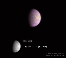| 21. April 2007 Im UV werden die Wolkenformationen auf dem Planeten Venus sichtbar. Mit einem S-II-Filter ist es sogar möglich, den Anteil von Schwefeldioxid in der Venusatmosphäre nachzuweisen und auf den Chip zu bannen! Zur größeren Ansicht » |