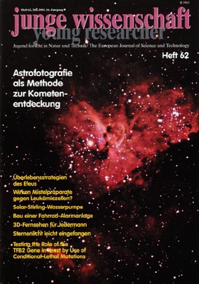 Titelbild der Fachzeitschrift junge wissenschaft. Aufgenommen von Sebastian Voltmer mit Verweis auf seinen 9-seitigen Artikel "Astrofotografie als Methode zur Kometenentdeckung".