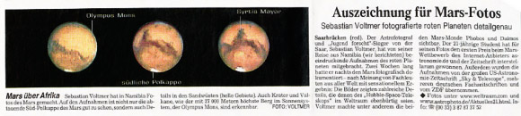 1. Preis Marsfoto des Monats (Astronomie.de) 7. September 03 Der mächtige Vulkan Ulympus Mons mit 27 km Höhe ist am rechten Rand als heller Fleck zu erkennen!