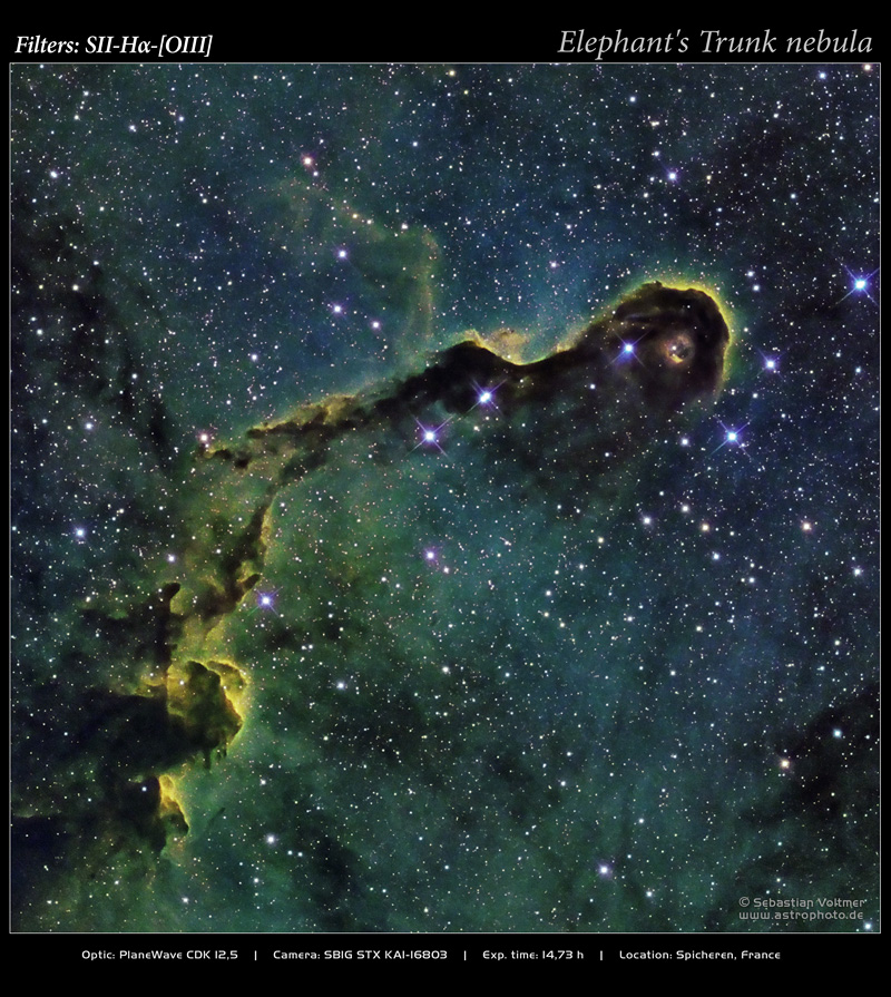 IC 1396b - der Elefantenrüssel-Nebel Die Gesamtbelichtungen der Farbauszüge: Ha 588min = 9,8 h OIII 152min = 2,53 h SII 144min = 2,4 h