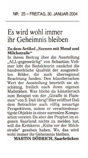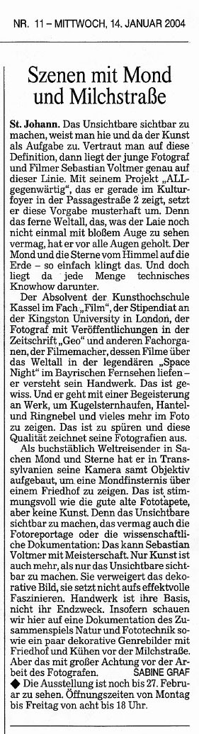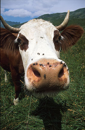 | In der Kritik vom 14.1. zu meiner Ausstellung "All-gegenwärtig" im Kulturfoyer, Passagestraße 2 in Saarbrücken, schreibt Frau Sabine Graf, dass ich u.a. Fotos mit "Kühen vor der Milchstraße" ausgestellt habe. Leider fehlt ein solches Foto. Um den Text von Frau Graf wenigstens halbwegs richtigzustellen, habe ich beschlossen, die Ausstellung um das Foto "Einzelkuh ohne Milchstraße" zu ergänzen. Auf dem Bild kann man deutlich Fliegen auf der Schnauze und um die Nasenlöcher einer Kuh erkennen, die an Strukturen im Weltall erinnern - an Einzelsterne und Sternhaufen. Im Hintergrund ist der Tageshimmel mit Wolken zu sehen. |