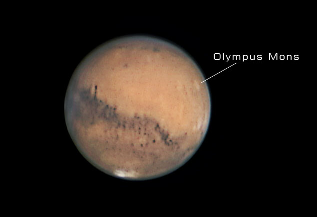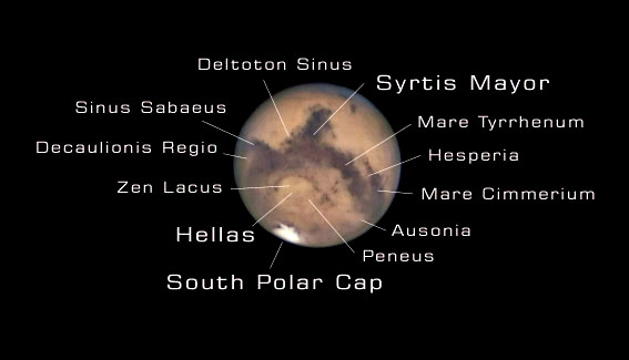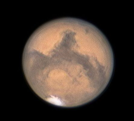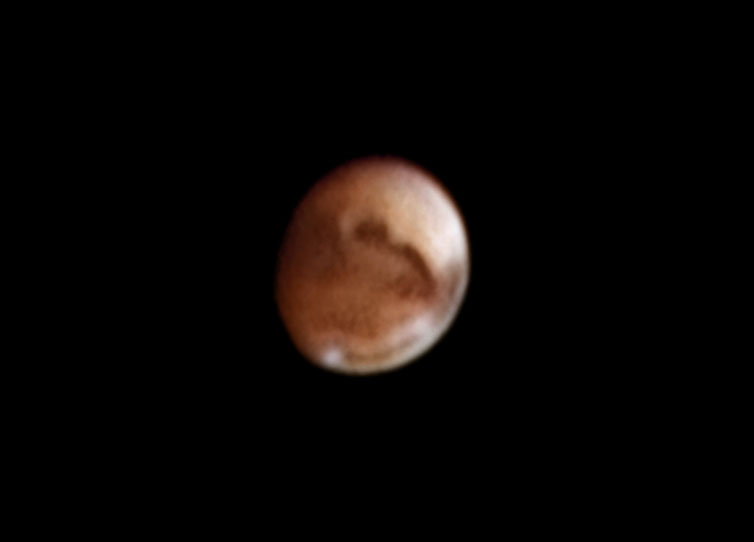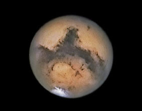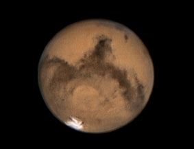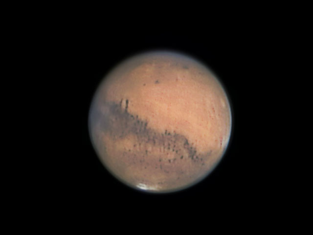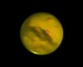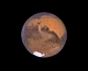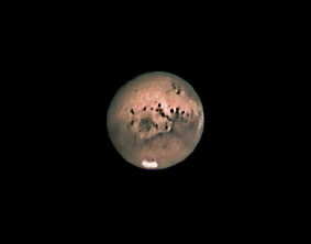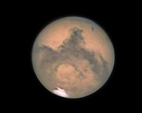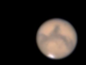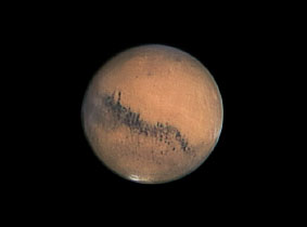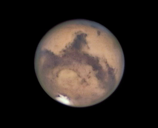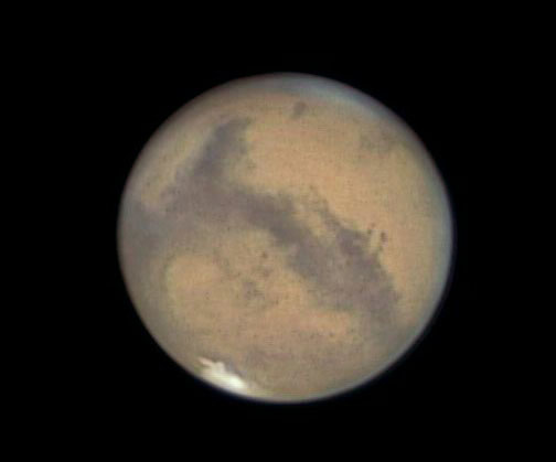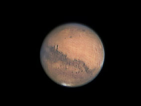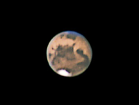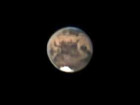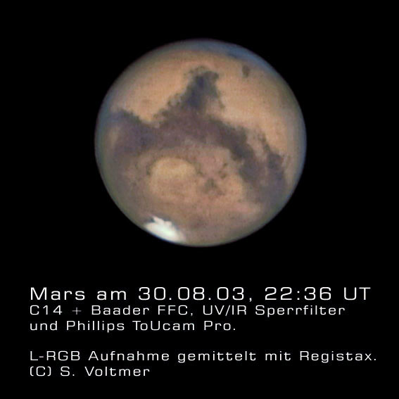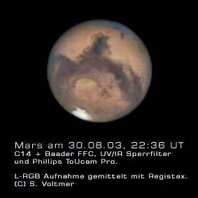 Marsopposition 28. August 03 / 21:15 UT Aufnahmeinstrument war ein C14 + FFC und UV/IR blocking Filter in Verbindung mit der ToUcam Pro. Gemittelt wurden 1100 Frames mit Registax. |