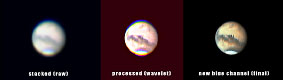 20. September 03 / 22:30 UT I-RGB-Aufnahme am C11 + Baader FFC und UV/IR blocking Filter in Verbindung mit der ToUcam Pro. Es wurden jeweils 30% von 2000 Video-Frames mit Registax gemittelt. |