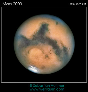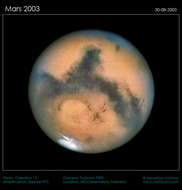 Im August 2003 war der Rote Planet der Erde so nah wie seit 56.000 Jahren nicht mehr. Doch bei uns in Mitteleuropa stand er leider sehr tief am Horizont - Grund genug, um sich in südliche Gefilde aufzumachen. Mich hatte es damals auf die Farm Hakos nach Namibia gezogen, wo sich dem Astrofreund ein Eldorado unter dem südlichen Sternenhimmel bietet. Als IAS-Mitglied konnte ich damals das C14 der "Internationalen Amateursternwarte e.V." für die Marsaufnahmen nutzen. Das Seeing lag in einigen Nächten bei 0,3 Bogensekunden, was die relativ hohe Auflösung der Aufnahmen erklärt (rechts). Gut zu erkennen ist der Krater Hygens am Rande von Syrtis Major und die strukturreiche Polkappe, die im Vergleich zur Marsopposition 2005 stark ausgebildet war.