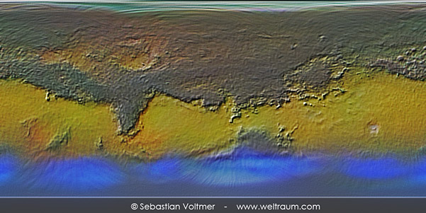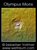 Diese Reliefkarte wurde aus der Differenz zwei gegeneinander verschobener Aufnahmen erzeugt. Dadurch werden einige Strukturen - man beachte den Vukan Olympus Mons - im Relief hervorgehoben. Die großflächigen dunklen Gebiete liegen allerdings tiefer. Die Krater und andere kleine Strukturen werden richtig dargestellt.