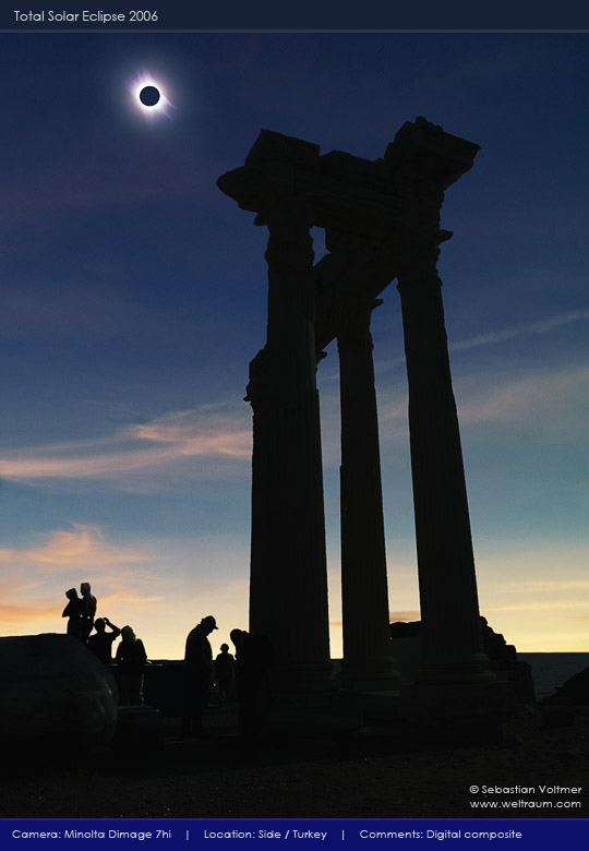 Sonnenfinsternis über dem Tempel des Apollon, Gott des Lichtes, der Schönheit und der Kunst (Montage). |