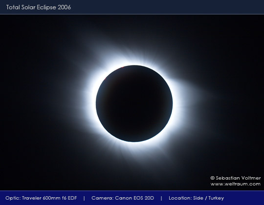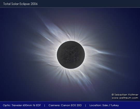 Ausgedehnte Korona, aufgenommen bei 200mm f/4. HDR-Komposit aus 20 Aufnahmen. |