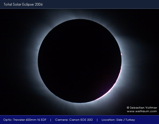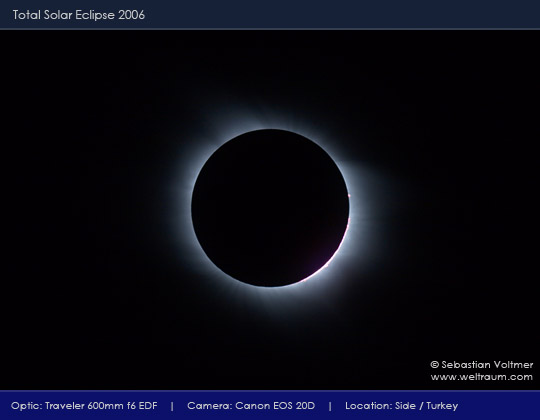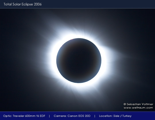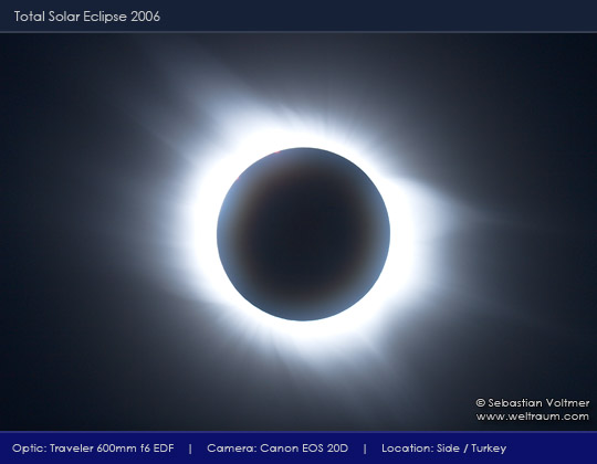 Bei kürzeren Belichtungszeiten treten die Strukturen der inneren Korona hervor. Es fehlen jedoch die Ausläufer der äußeren Korona. |