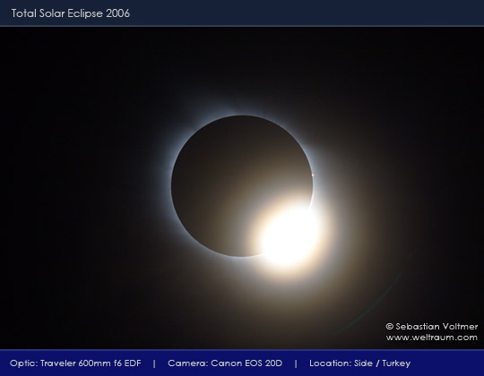 Der Diamantring-Effekt kurz vor dem 2. Kontakt. Der Kernschatten erreicht die Küste von Side und die Korona erstrahlt. (HDR-Komposit) |