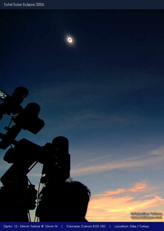 Unter der verfinsterten Sonne sieht man das Teleskop, an dem ich die Sonnenfinsternis-Aufnahmen machen konnte. (Foto: Dr. Ulrike Voltmer) |