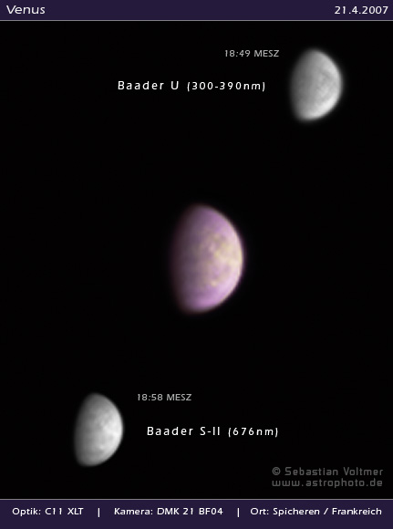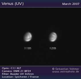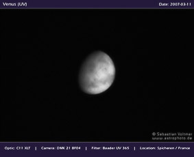 Im ultravioletten Licht werden die Wolken der Venus sichtbar. Für diese Aufnahme wurde ein Baader U- und ein IR pass-Filter eingesetzt. Aufgenommen mit einem Celestron 11 XLT bei 2800mm Brennweite.