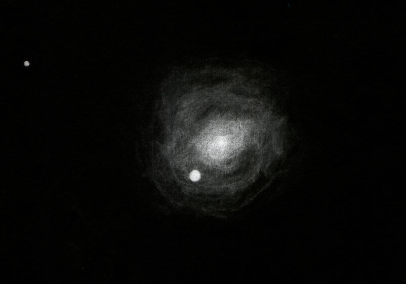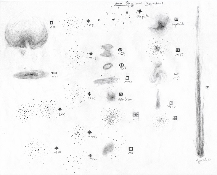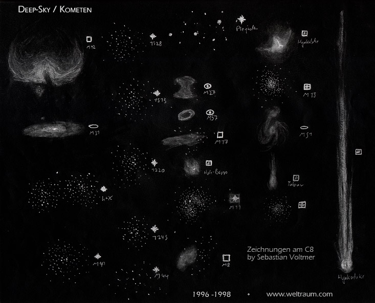 Jupiter am 17.08.1998 gezeichnet am C8 bei 200-facher Vergrößerung ![]() Mars am 13.03.1999 gezeichnet am C8 bei 200-facher Vergrößerung ![]() Supernova in Galaxie M96 am 17.05.1998 gezeichnet am C8 bei 200-facher Vergrößerung ![]() Komet Hyakutake am 28.03.1997 gezeichnet ohne zusätzliche Optik ![]() Komet Tabur am 13.10.1996 gezeichnet am C8 bei 80-facher Vergrößerung ![]() Hale-Bopp am 3.10.1996 gezeichnet am C8 bei 80-facher Vergrößerung ![]() Orion-Nebel-Trapez (13.12.1997) gezeichnet am C8 bei 200-facher Vergrößerung ![]() Homunculus-Nebel gezeichnet am C14 (f/6,3) + 10mm Plössel ![]() IAS Hakos, 20./21.03.01 Homunculus-Nebel im Vergleich ![]() Mars 1995 ![]() |