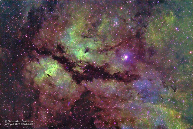 Object.................: Cygnus RegionDate & location........: Spicheren, France Author.................: Sebastian Voltmer focal length, f/ratio..: 630mm, f/5.8 Film / CCD.............: SBIG STL 11000 Filter.................: SII (R), Ha (G), OIII (B) Guiding................: AP GTO900, self- |