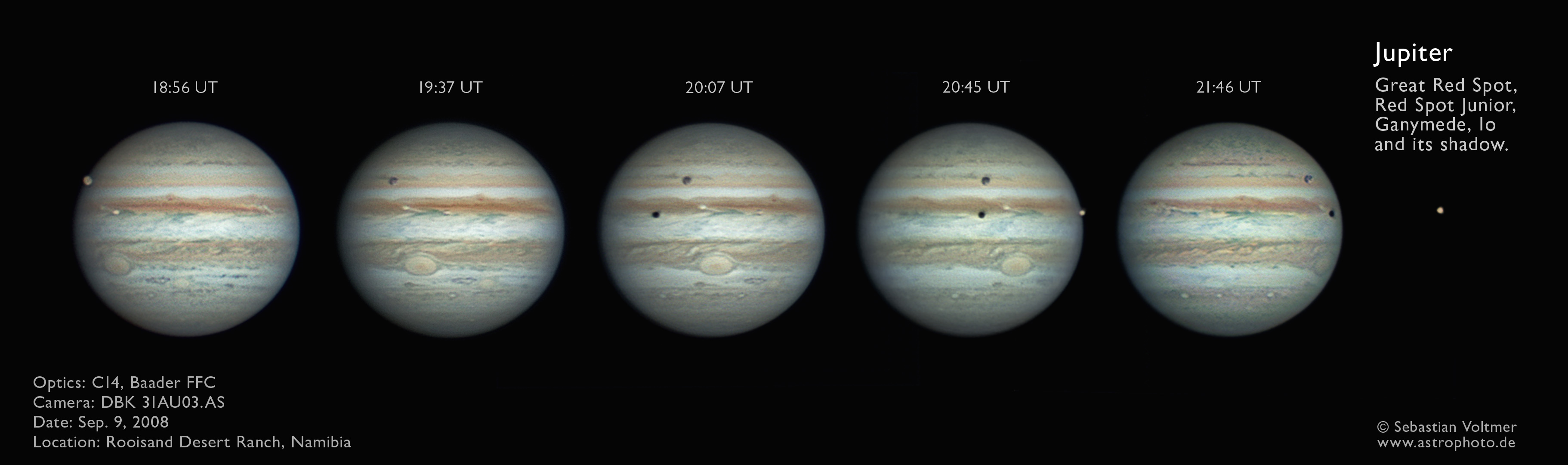 Jupiters Großer und Kleiner Roter Fleck standen im Blickwinkel der Erde, während die beiden Monde Ganymed und Io die Planetenscheibe passierten. Letzterer warf einen dunklen Schatten auf Jupiter. Wenn man die Serie genau betrachtet, fällt auf, dass Ios Schatten Ganymed überholt hat. |