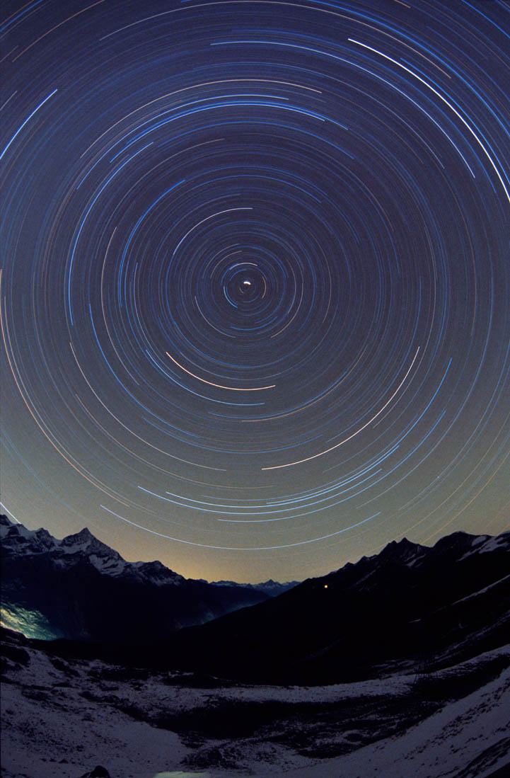 6 Stunden belichtet auf Kodak EPP 100 (hyp.) bei 16mm f/8 Datum: September 1998 Ort: Gornergrat bei Zermatt / Schweiz Foto: Sebastian Voltmer |